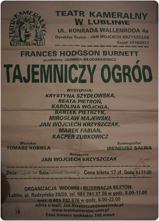 Dnia 2.11.2016 r. uczniowie klasy IV, V i VI, pod opieką wychowawców- Elżbiety Węcławik, Doroty Łacińskiej, Elżbiety Nowak i Jadwigi Capiuk, byli na wycieczce w Hrubieszowskim Domu Kultury na przedstawieniu pt. "Tajemniczy ogród". Spektakl zaprezentowali aktorzy z lubelskiego Teatru Kameralnego. Bardzo podobała się nam gra aktorów i zwracanie uwagi widzów na ponadczasowe wartości, takie jak praca, pomoc innym, przyjaźń. Sztuka trwała około 100 minut i zachwyciła nas swoją scenografią, muzyką, która w doskonały sposób stopniowała napięcie i uzupełniała grę aktorów.