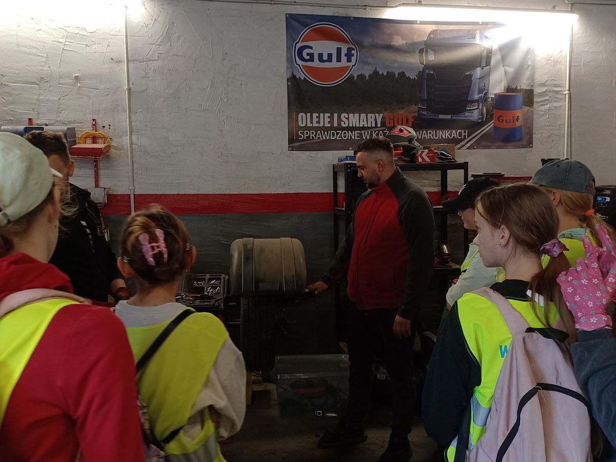 warsztatu (na marginesie dość nowoczesnego), mieli możliwość obserwowania czynności związanych z wymianą opony w kole, użycia narzędzi. Pan Kamil