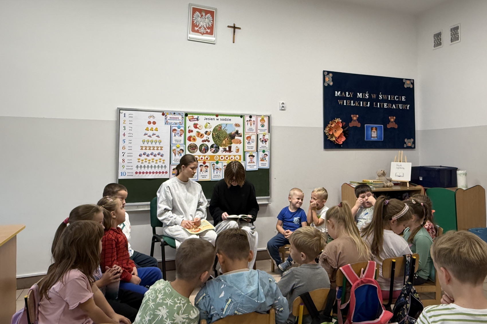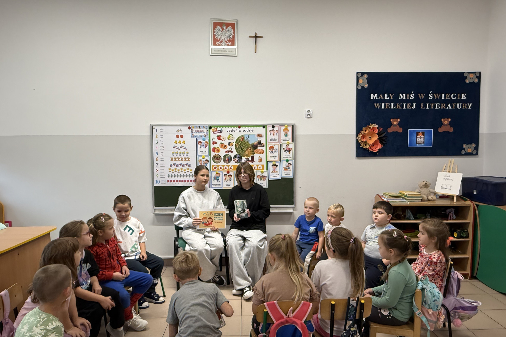W tym wyjątkowym dniu, w czytanie zaangażowały się uczennice klasy VIII – Weronika Kierych i Emilia Wolanin, które przedstawiły najmłodszym historię o tym, jak współdziałanie zwierząt doprowadziło do uratowania kociej rodziny z powodzi. Dzieci z wielkim zainteresowaniem słuchały przeczytanego opowiadania, aktywnie uczestnicząc w rozmowach na temat treści i bohaterów książek. Poznały uniwersalne wartości, takie jak współpraca w grupie, czy też wzajemna pomoc.