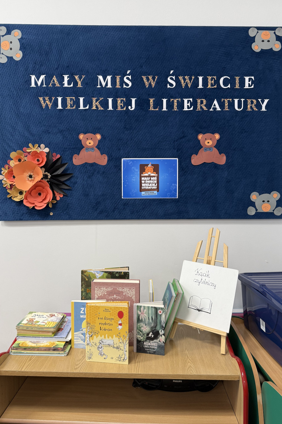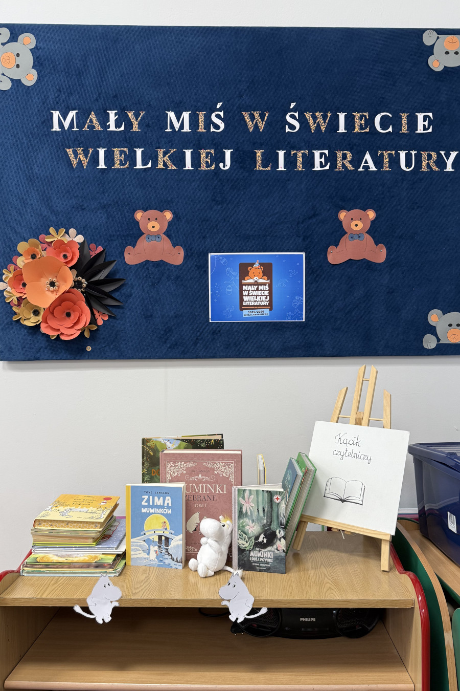 Następnie przystąpiliśmy do głównej części wydarzenia – czytania na głos wybranych utworów literatury dziecięcej. Wśród przedstawionych książek, z okazji 80- lecia pierwszej publikacji opowieści o Muminkach, znalazły się m.in.: fragmenty z książki „Dolina Muminków” oraz „Muminki i duża powódź” Tove Jansson.