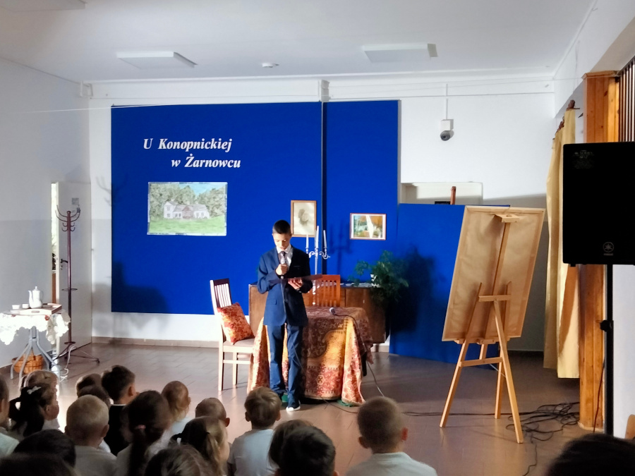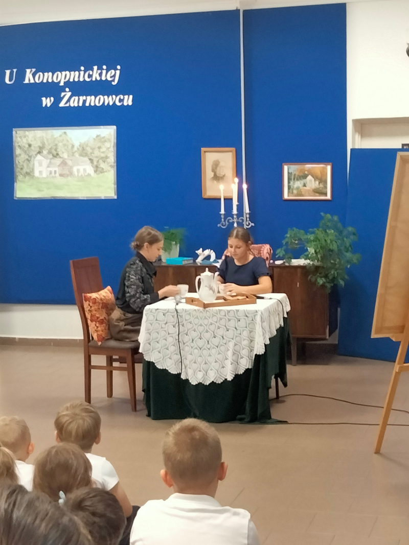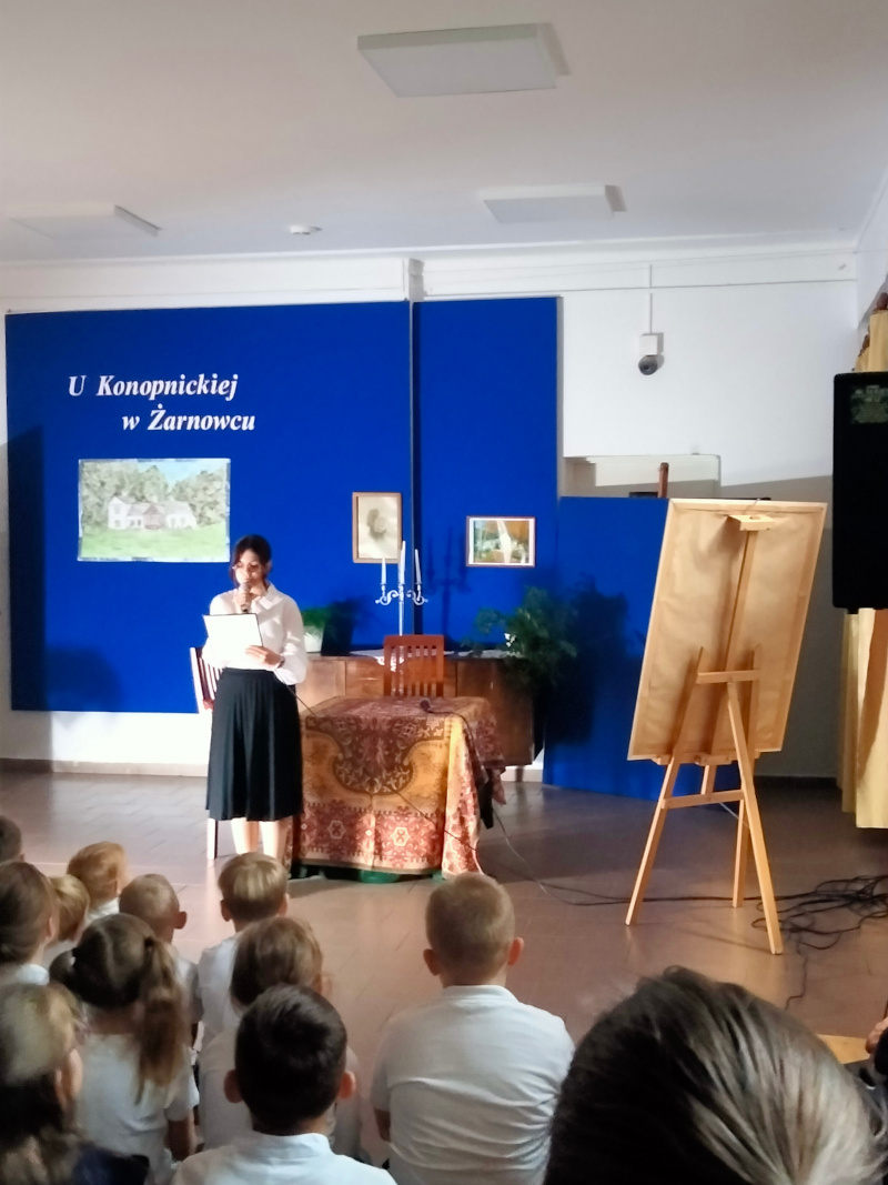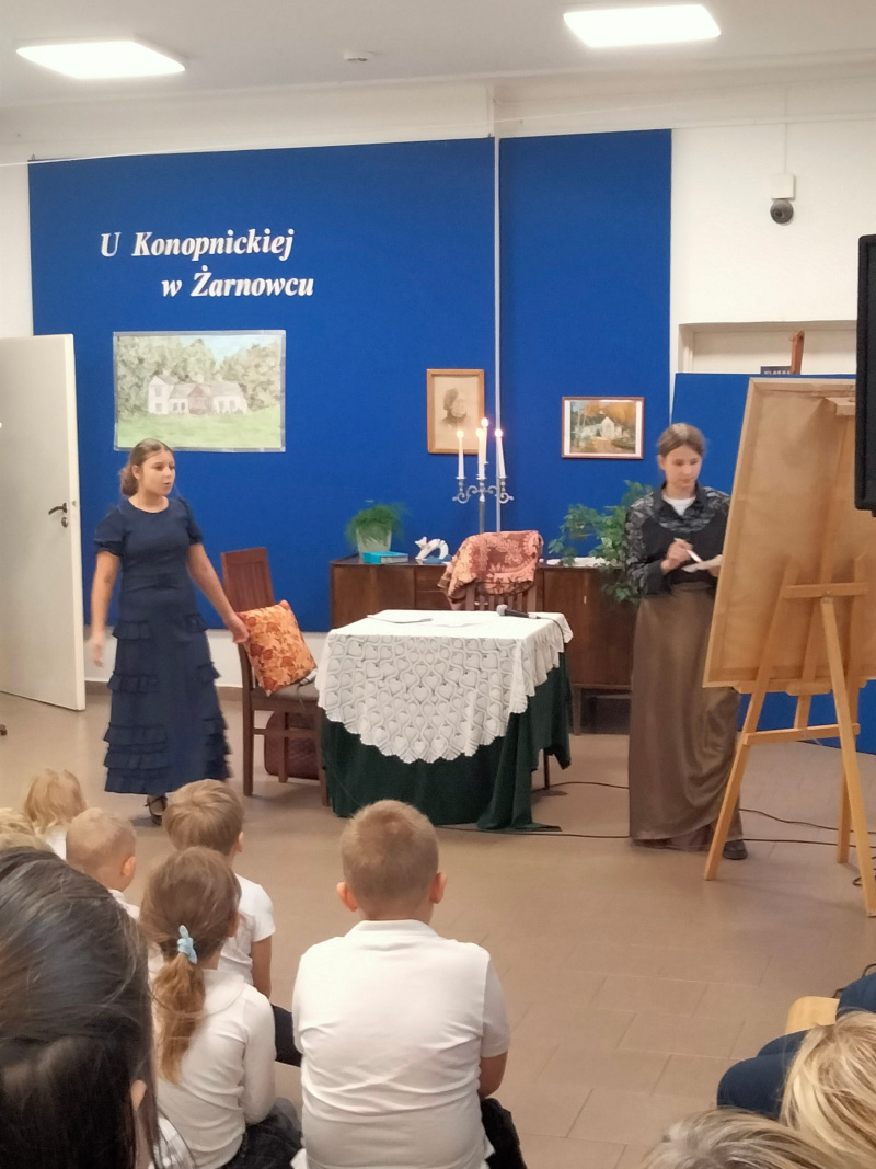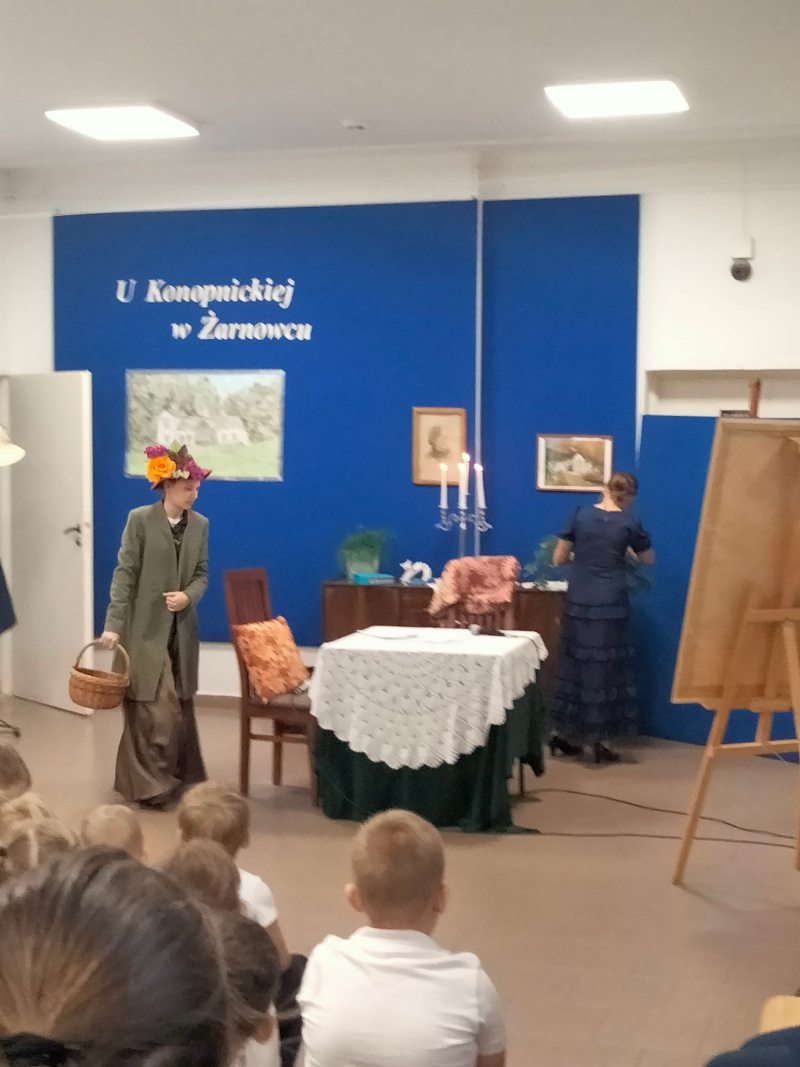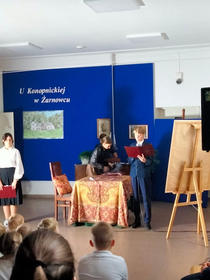 Następnie uczniowie klasy VII zaprezentowali przedstawienie teatralne pt. „U Marii Konopnickiej w Żarnowcu.” W tle scenografii widniał obraz, namalowany