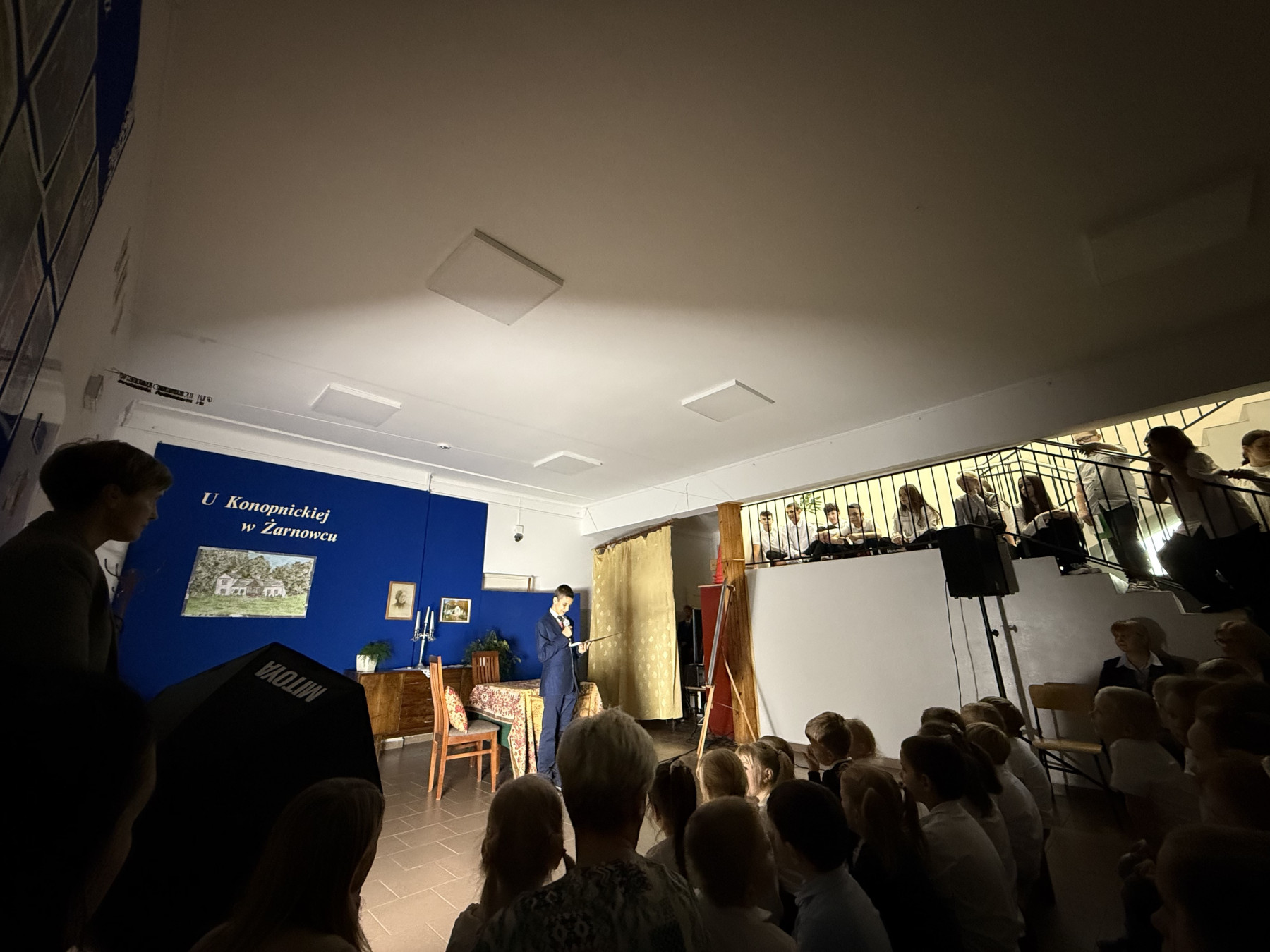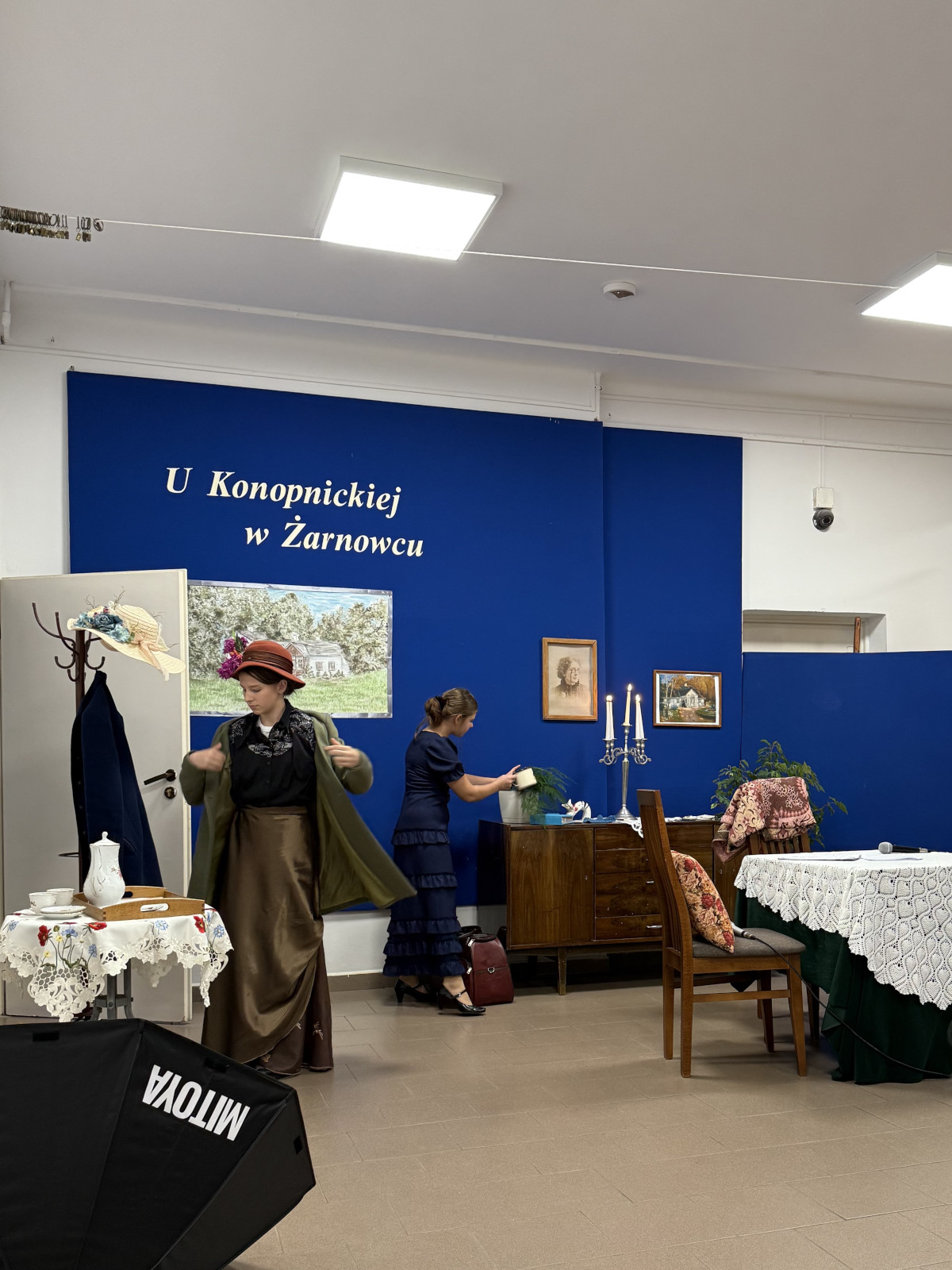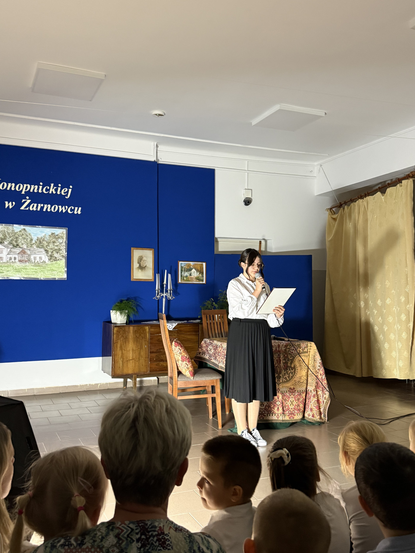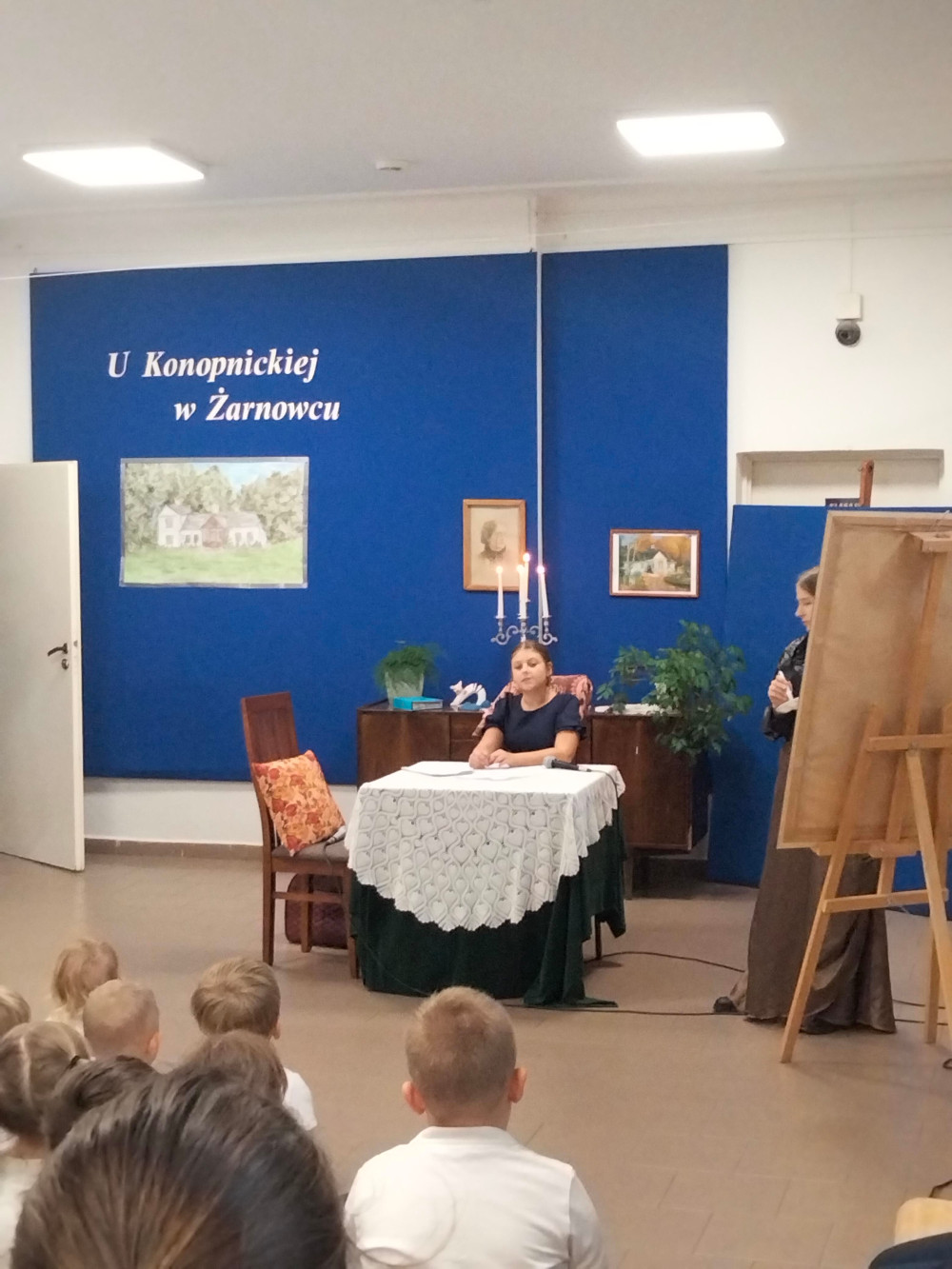 Następnie uczniowie klasy VII zaprezentowali przedstawienie teatralne pt. „U Marii Konopnickiej w Żarnowcu.” W tle scenografii widniał obraz, namalowany