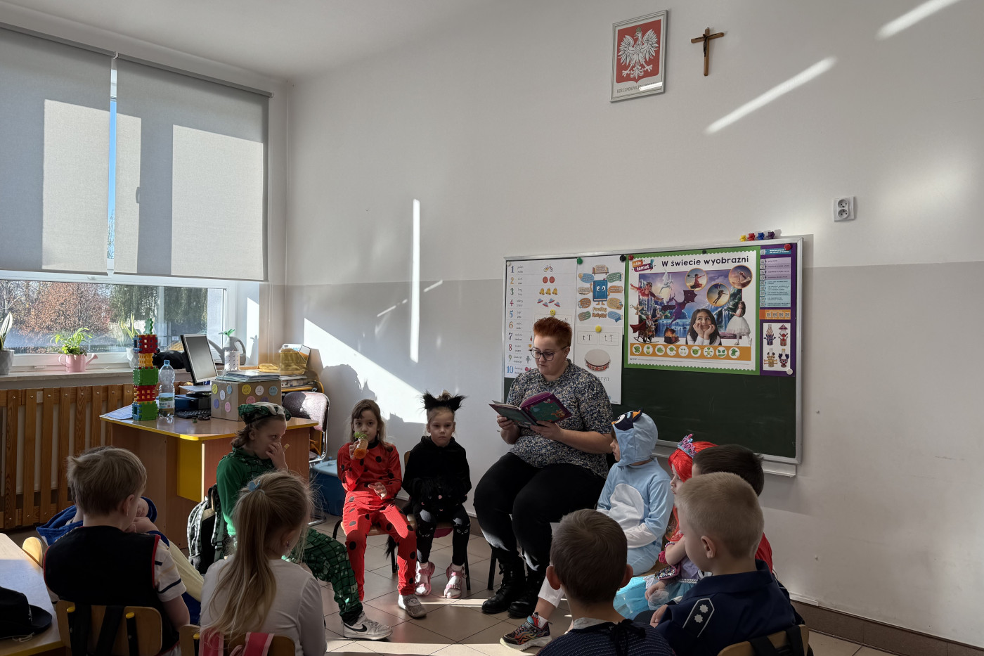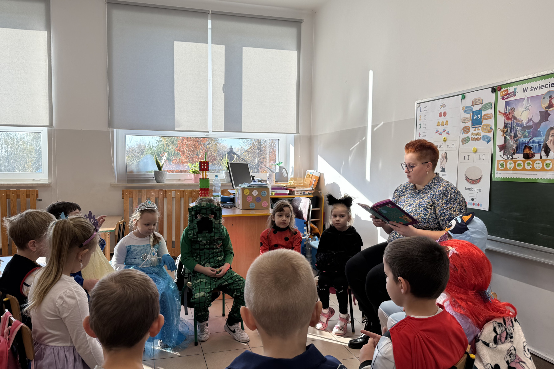 W grupie dzieci 3- 4- letnich, dzień rozpoczęliśmy od powitania i prezentacji strojów. Każde dziecko mogło pochwalić się swoim przebraniem i opowiedzieć, z jakiej bajki pochodzi jego postać. Następnie, najmłodsi uczestniczyli w różnorodnych zabawach związanych z bajkami – rozwiązywały zagadki, układały puzzle z bohaterami oraz brały udział w quizie wiedzy bajkowej. Nie zabrakło też wspólnego tańca i bajek czytanych przez nauczyciela.