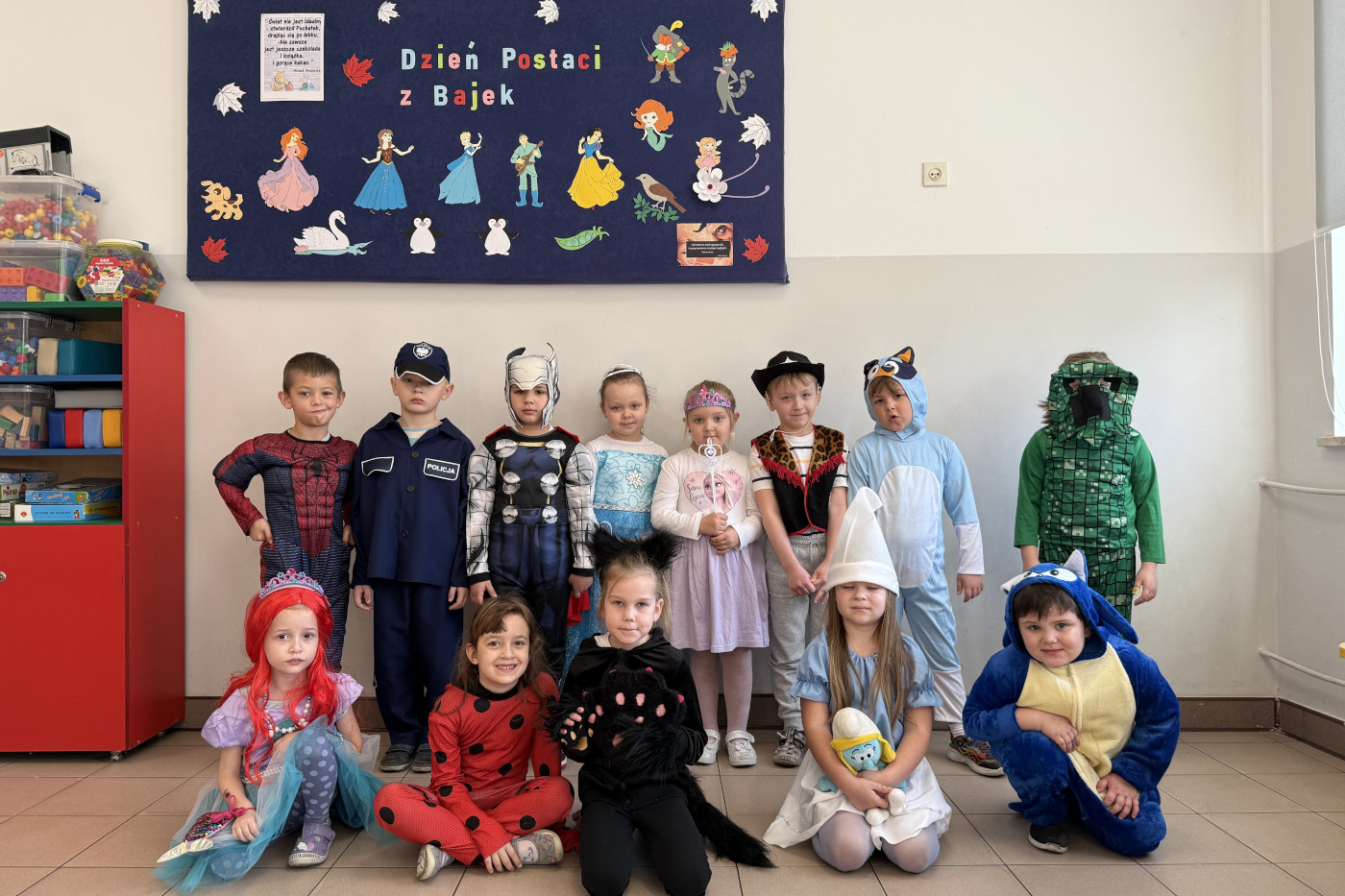Dzień Postaci z Bajek był wyjątkowym wydarzeniem także w grupie pięcio- i sześciolatków. Nasza sala zamieniła się w prawdziwą bajkową krainę! Dzień rozpoczęliśmy od wspólnej rozmowy o ulubionych bajkach i o tym, czego możemy się z nich nauczyć. Dzieci z uwagą