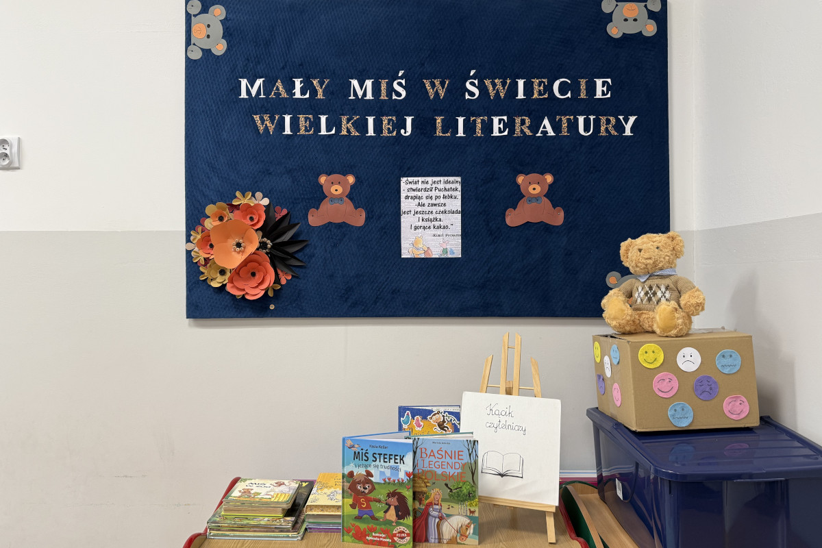 wysłuchały baśni, na podstawie utworu Charles’a Perrault’a, pt. „Kot w butach”’, którą przeczytała nam, mama Wiktorii – pani Joanna Wójcik. Młodzi odbiorcy mieli okazję do wypowiedzi na temat wysłuchanego tekstu oraz podzielenia się swoimi opiniami o postawie przedstawionych bohaterów. Następnie dzieci z zaangażowaniem wzięły udział w zabawie: „Z jakiej to bajki?”, w której rozpoznawały postacie po rekwizytach lub fragmentach ilustracji. Trudnym wyzwaniem było również ćwiczenie rozróżniania emocji z „Małym Misiem” – naszym szkolnym przewodnikiem po świecie literatury, mieszkającym w pudełku sensorycznym. W części plastycznej każdy sześciolatek wykonał portret „zaczytanego” misia.