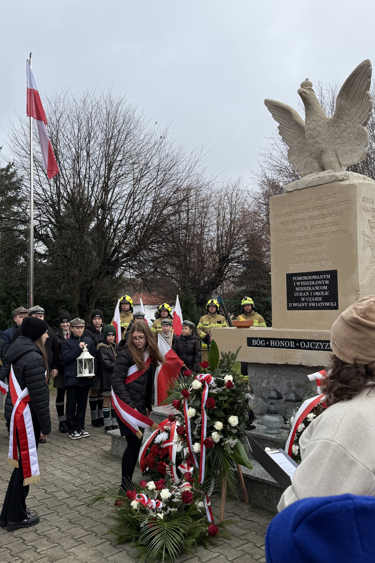 Po zakończeniu Mszy świętej uczestnicy uroczystości udali się do parku w Uchaniach, pod nowo odsłonięty pomnik upamiętniający bohaterów walczących o wolność Polski, gdzie odbyło się jego uroczyste poświęcenie przez księdza Proboszcza. Następnie delegacje władz samorządowych, instytucji, szkół i organizacji społecznych złożyły kwiaty i zapaliły znicze.
