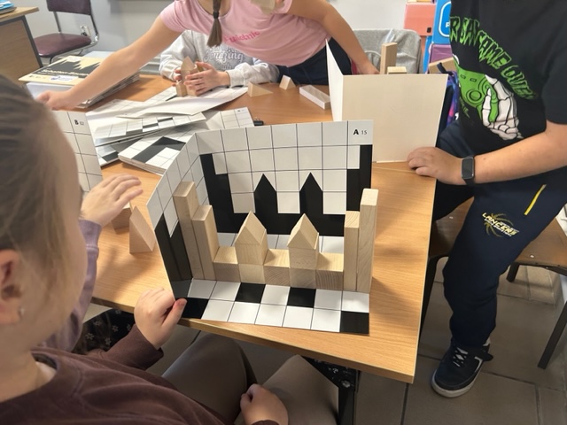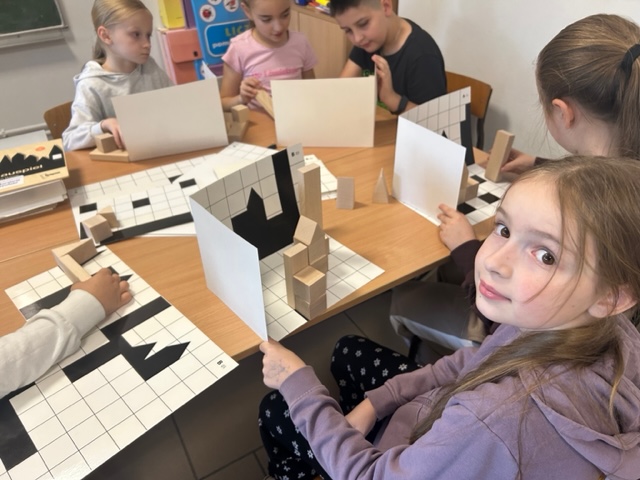 Uczniowie pracowali w grupach z klockami Schattenbauspiel. Uczyli się planowania, współpracy w grupie. Poznawali własności brył . Układali budowle według ustalonego wzoru, według cieni na planszy. Rozpoznawali jak należy zaplanować budowlę, rozwijali kreatywność i wyobraźnię przestrzenną. Były to zabawy, które przygotowują dzieci do nauki geometrii.