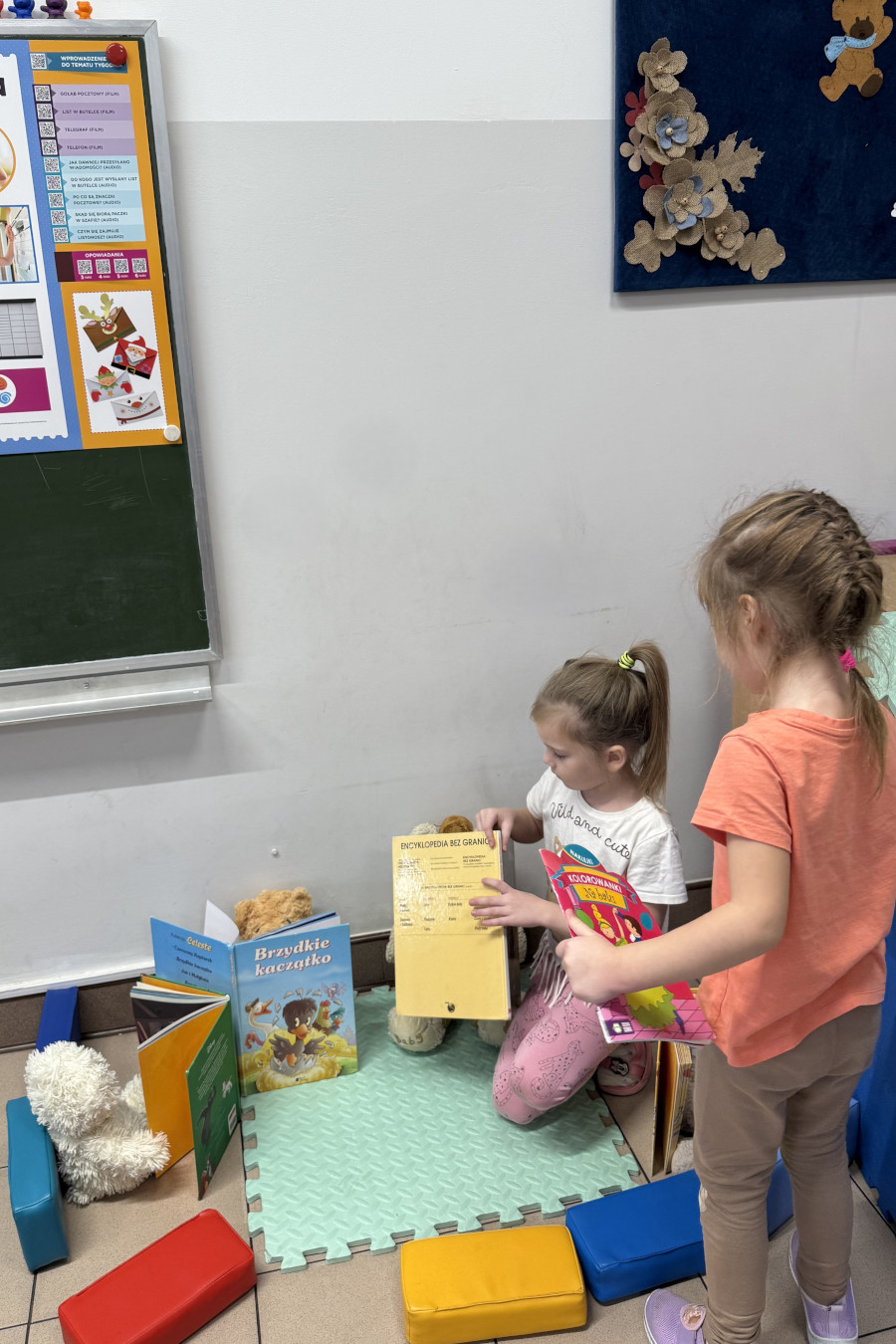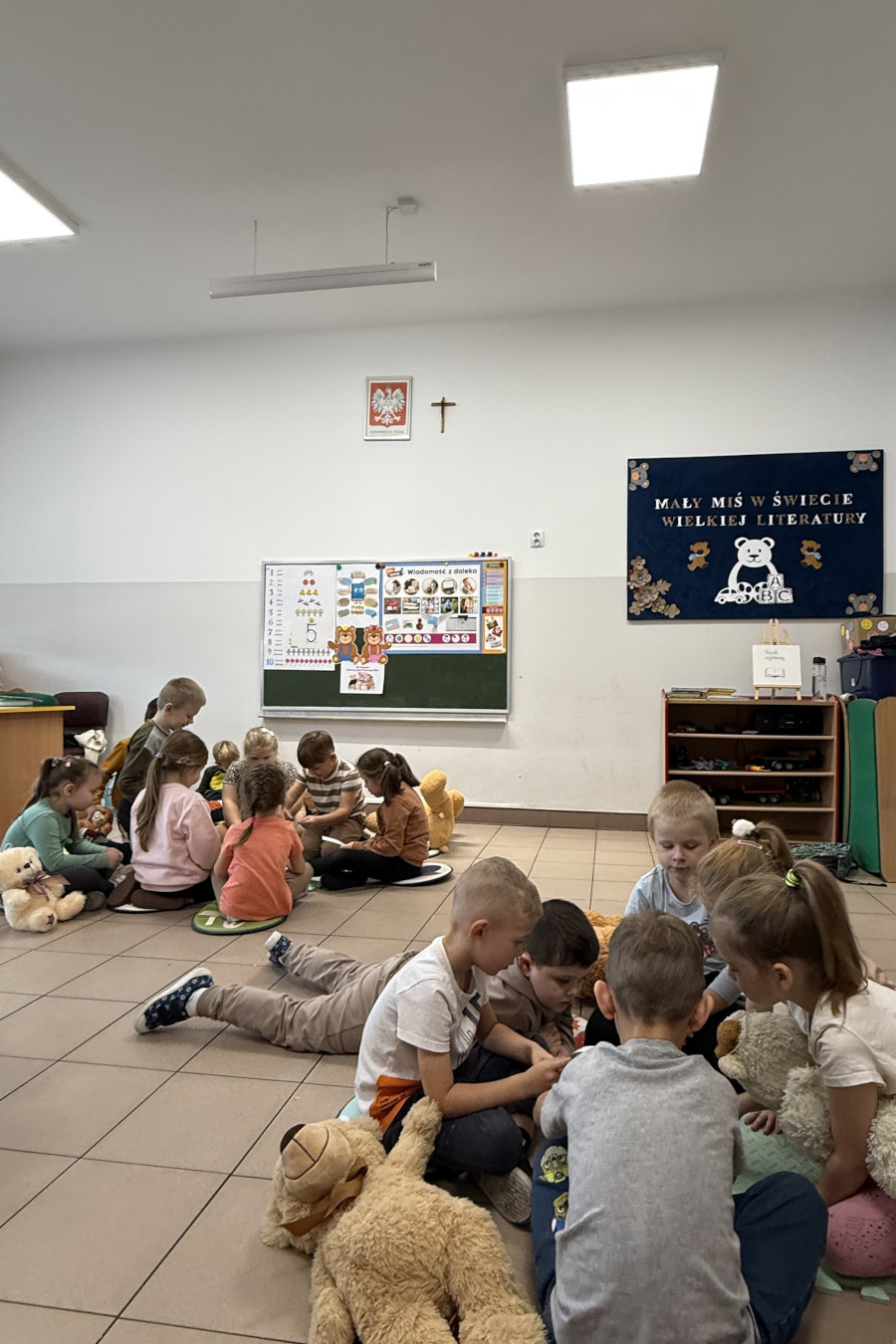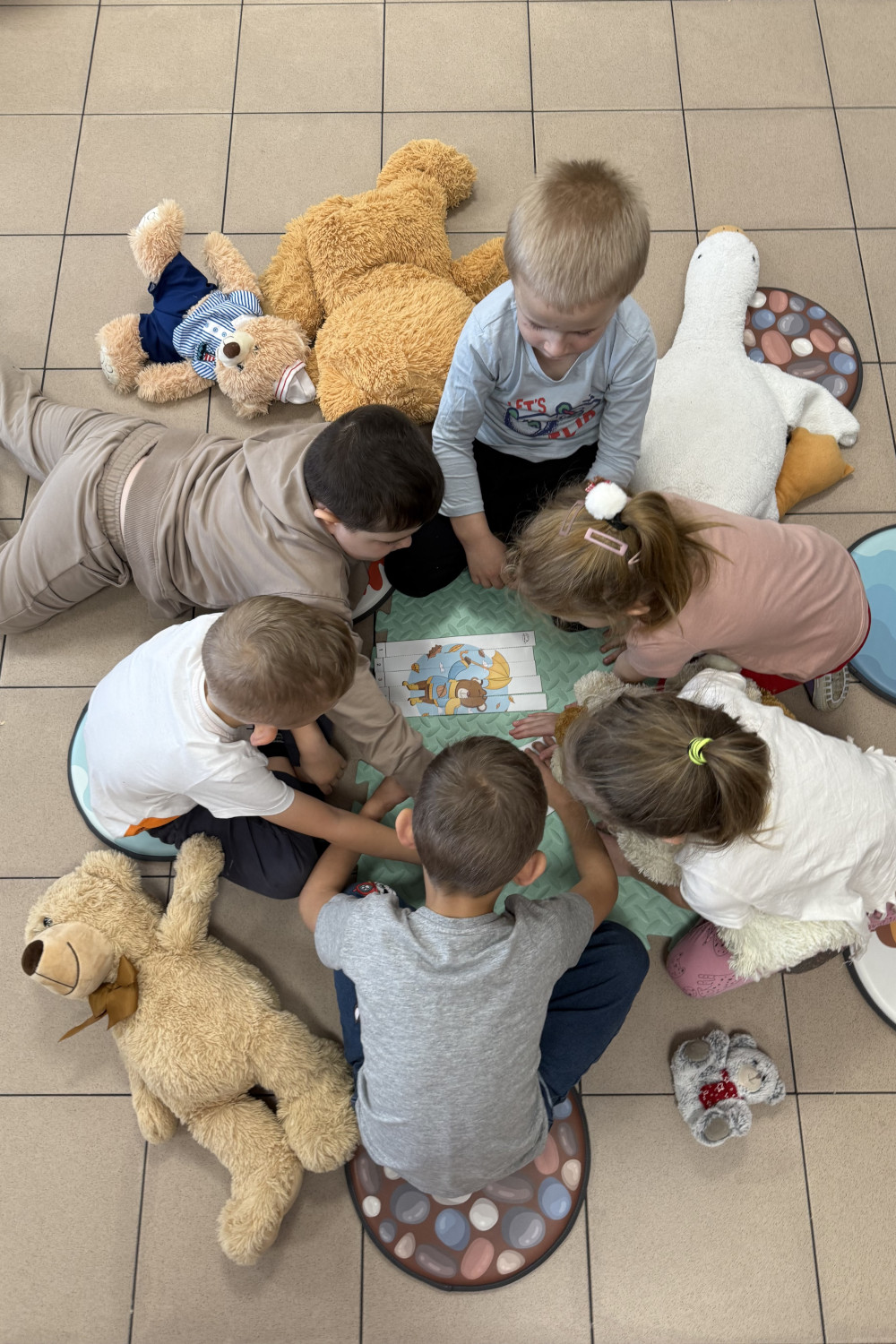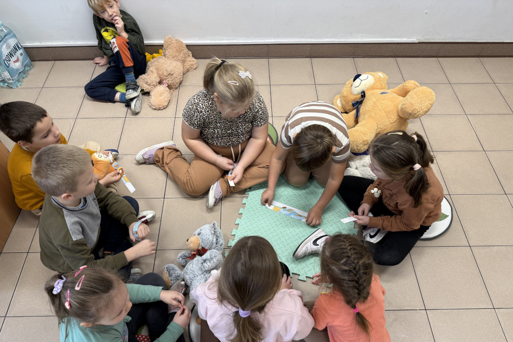Zajęcia rozpoczęliśmy krótką rozmową na temat historii pluszowego misia oraz tego, dlaczego jest on tak ważną zabawką dla wielu pokoleń. Dzieci chętnie dzieliły się opowieściami o swoich pluszakach i o tym, w jakich sytuacjach misie im towarzyszą.