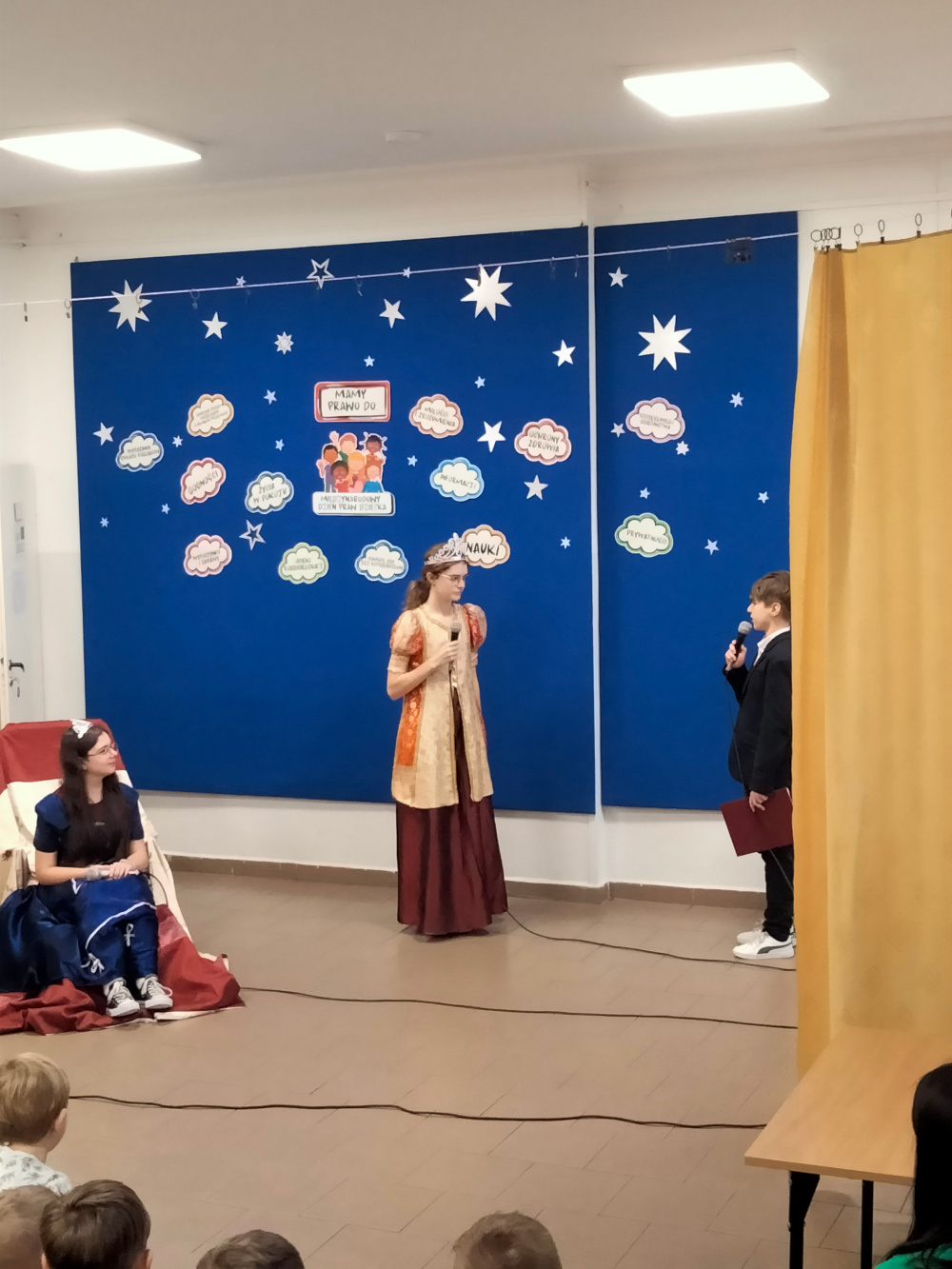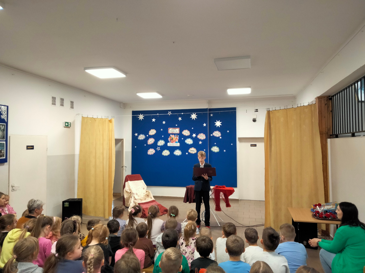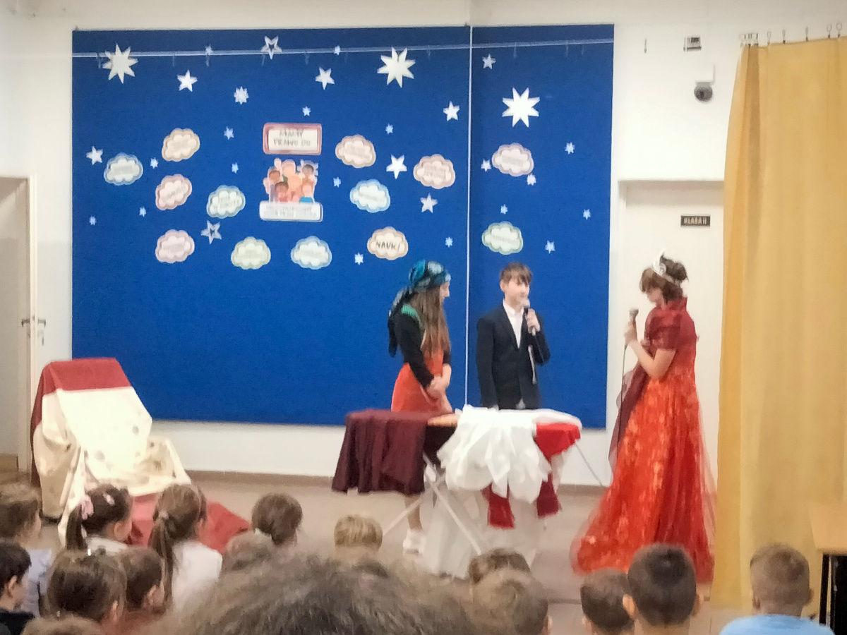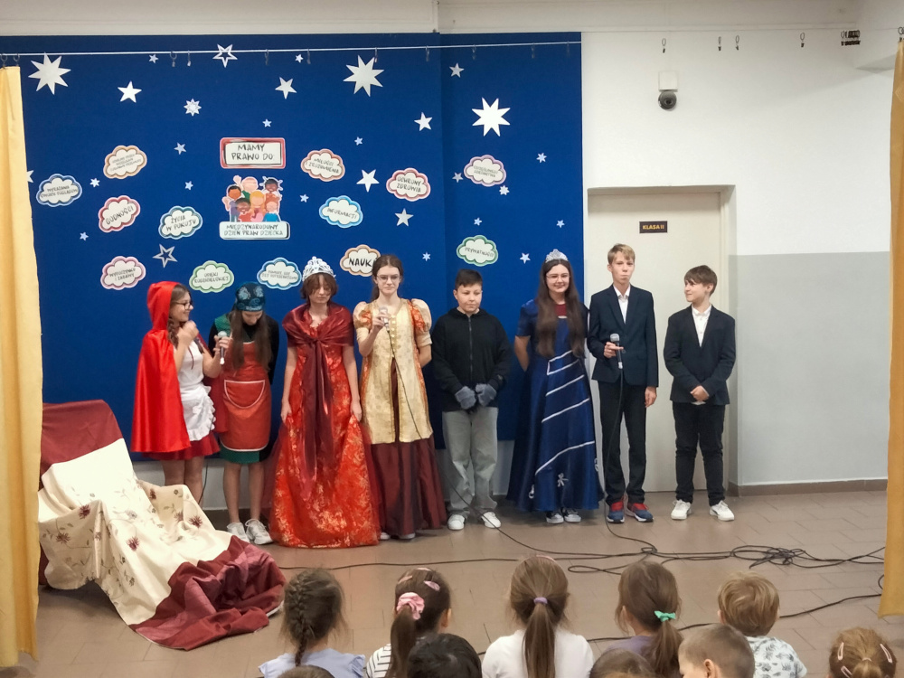 Z okazji Dnia Praw Dziecka uczniowie klasy VII, pod kierunkiem pani pedagog Jolanty Nowak, pani psycholog Izabeli Kaźmiruk, pani pedagog specjalny Agnieszki Mech, przygotowali krótkie przedstawienie, w którym w humorystyczny sposób nawiązali do znanych bajek. Zaprezentowano trzy scenki: z „Kopciuszka”, „Księżniczki na ziarnku grochu” oraz „Czerwonego Kapturka”. Każda z nich podkreślała ważne wartości związane z prawami dziecka – takie jak prawo do szacunku, bezpieczeństwa oraz równego traktowania. Występ spotkał się z dużym zainteresowaniem i został bardzo ciepło przyjęty przez publiczność.