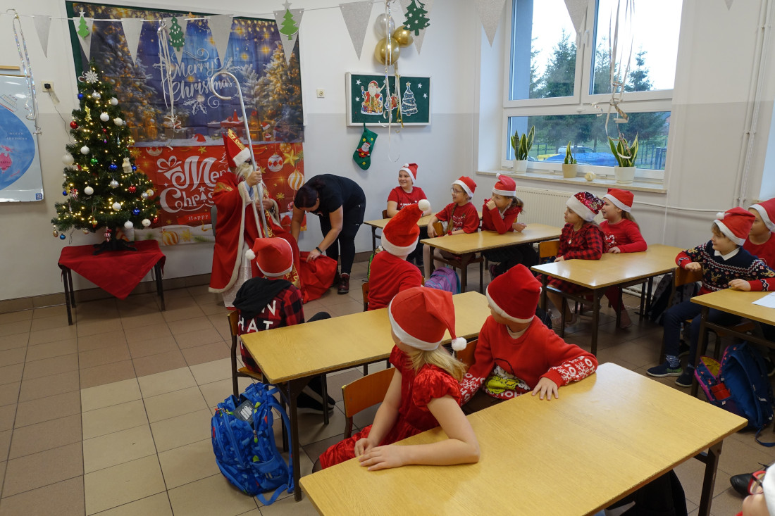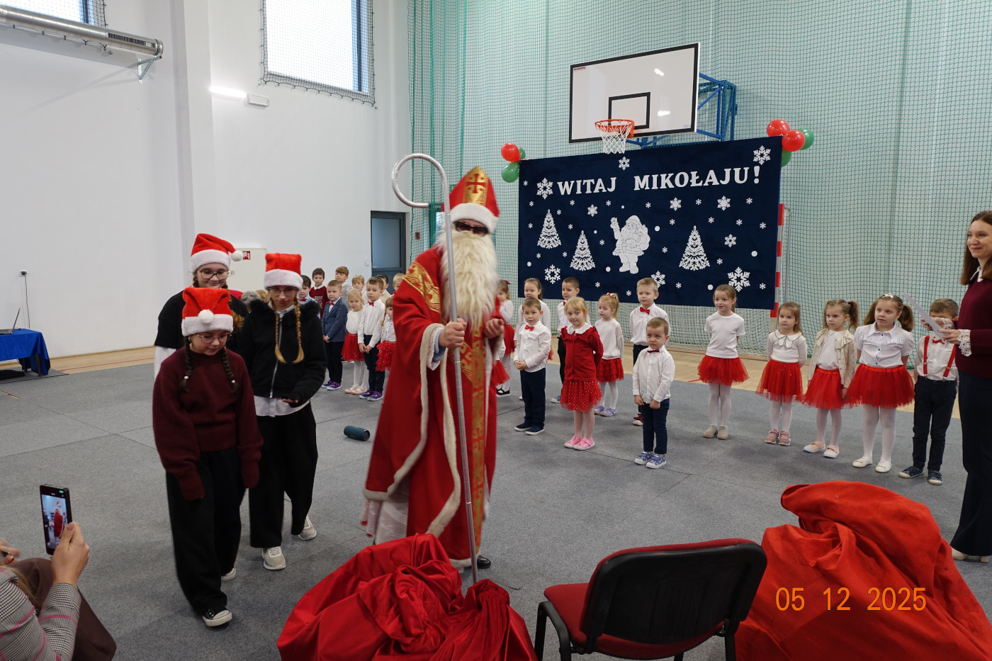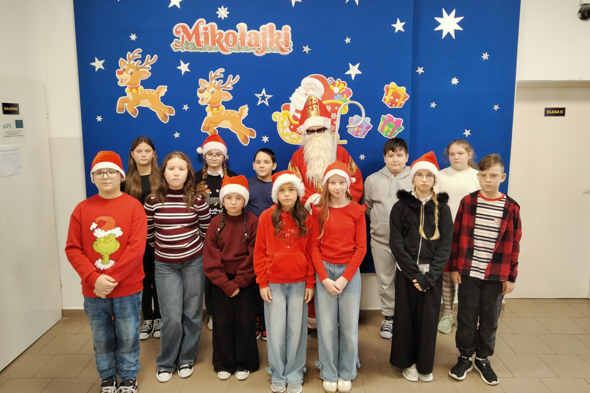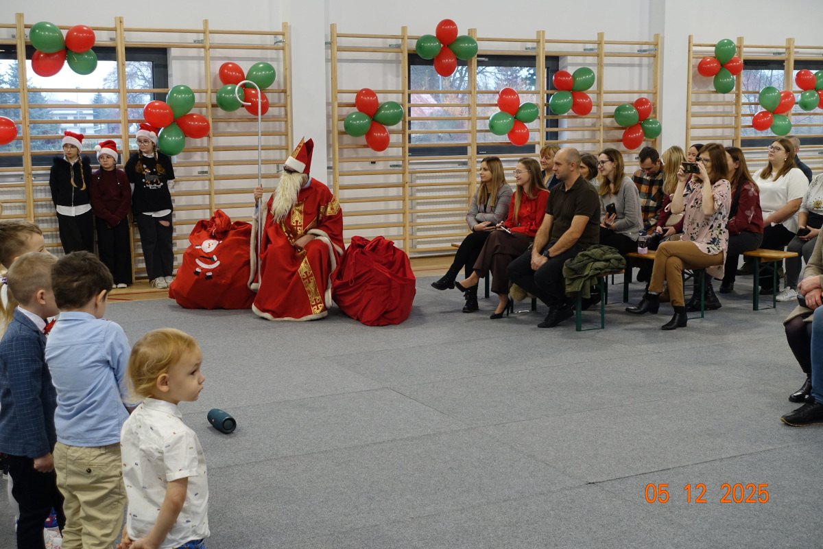 W szkole także tutaj pojawił się Mikołaj z pomocnikami, przynosząc słodkie upominki i dużo radości. Całe wydarzenie przebiegło w ciepłej, świątecznej atmosferze i sprawiło wiele uśmiechu zarówno młodszym, jak i starszym dzieciom.