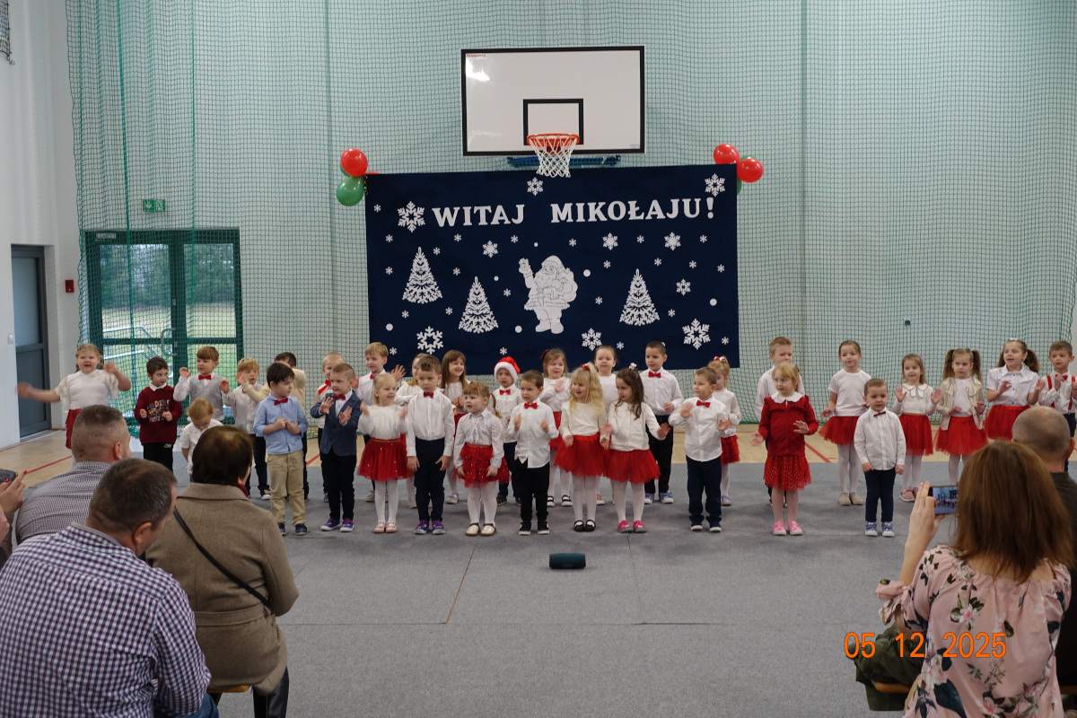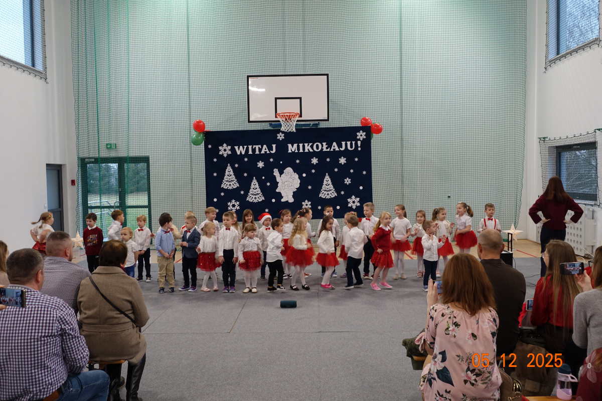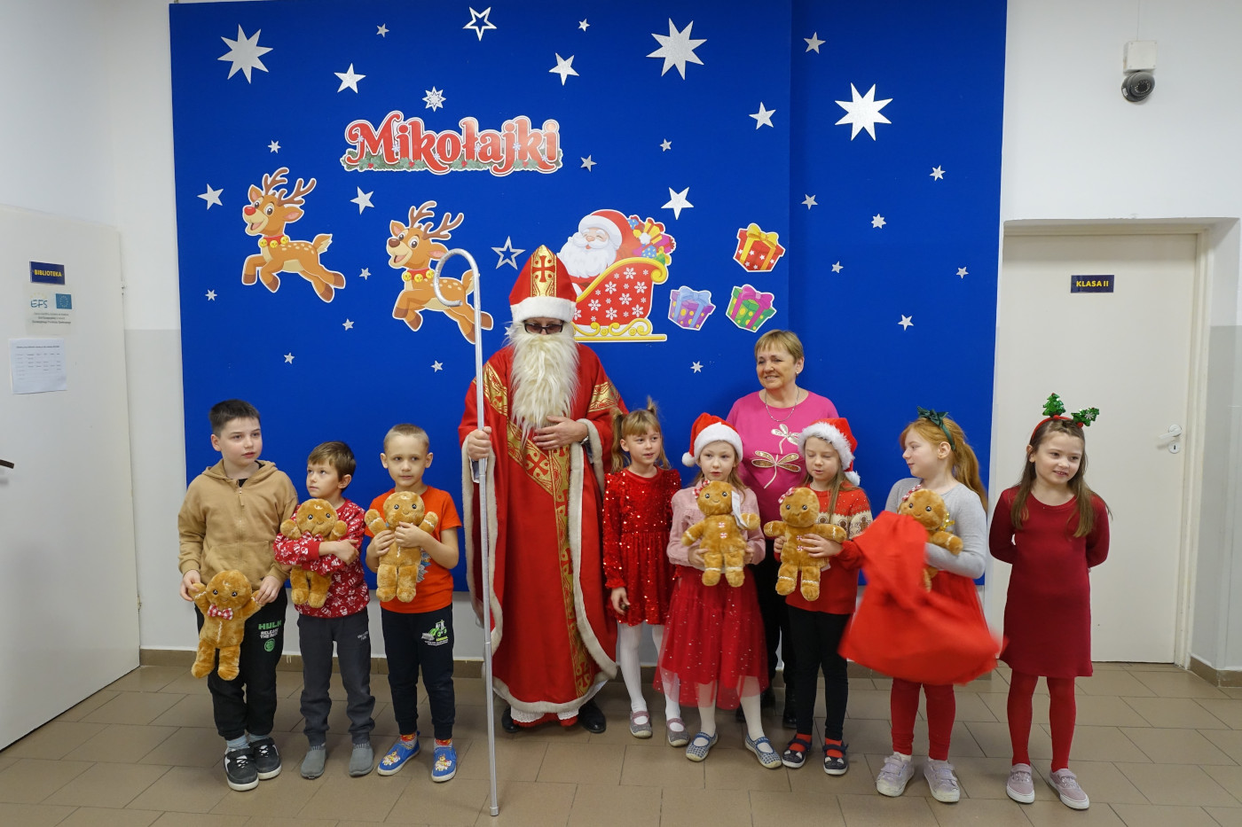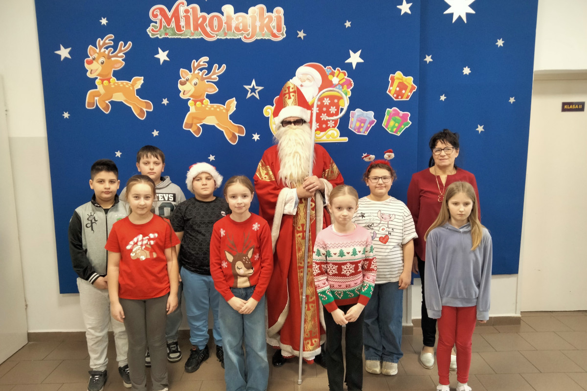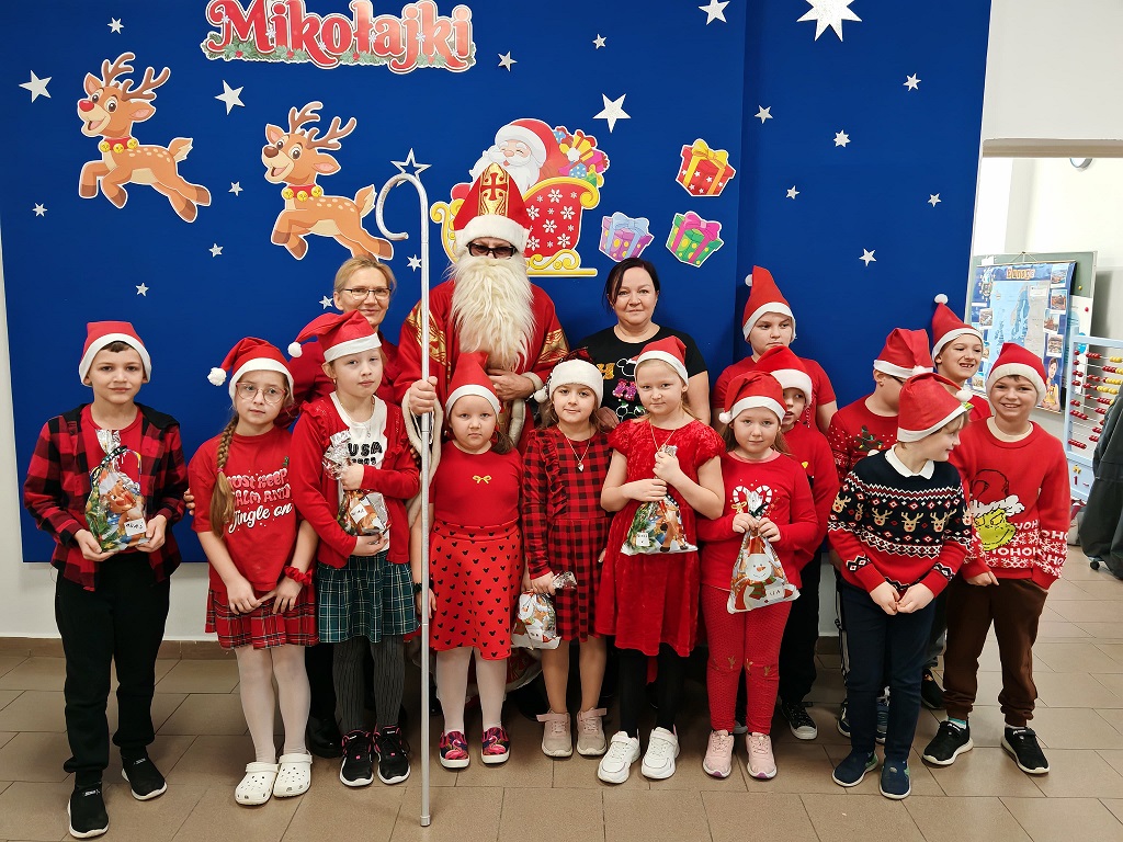 W szkole także tutaj pojawił się Mikołaj z pomocnikami, przynosząc słodkie upominki i dużo radości. Całe wydarzenie przebiegło w ciepłej, świątecznej atmosferze i sprawiło wiele uśmiechu zarówno młodszym, jak i starszym dzieciom.