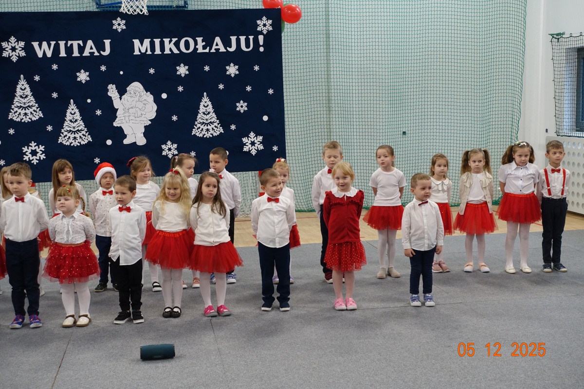 3-4 latki pod kierunkiem swojej pani- Diany Mydlak a 5-6 latki z panią Katarzyną Węcławik przygotowały wspólny występ. Dzieci śpiewały cztery piosenki i recytowały wierszyki. Święty Mikołaj, wręczył dzieciom drobne prezenty. Rodzice wykonywali pamiątkowe zdjęcia swoim pociechom.