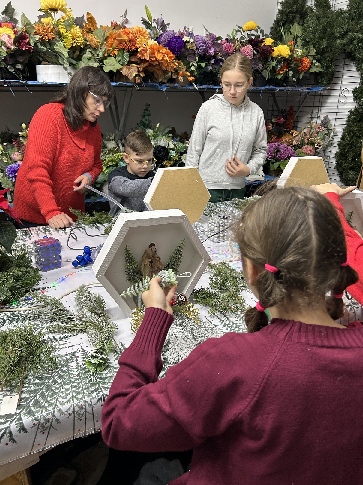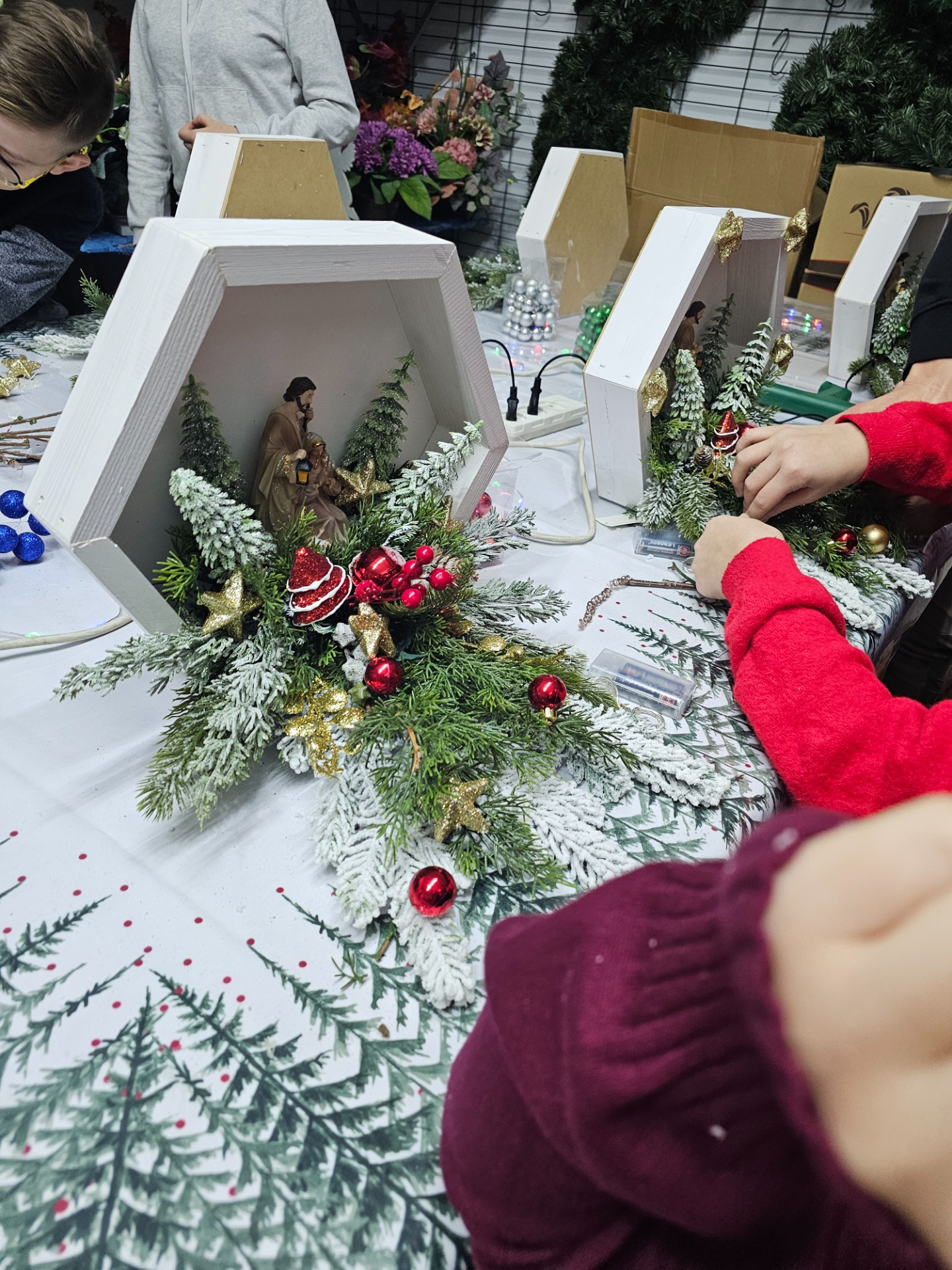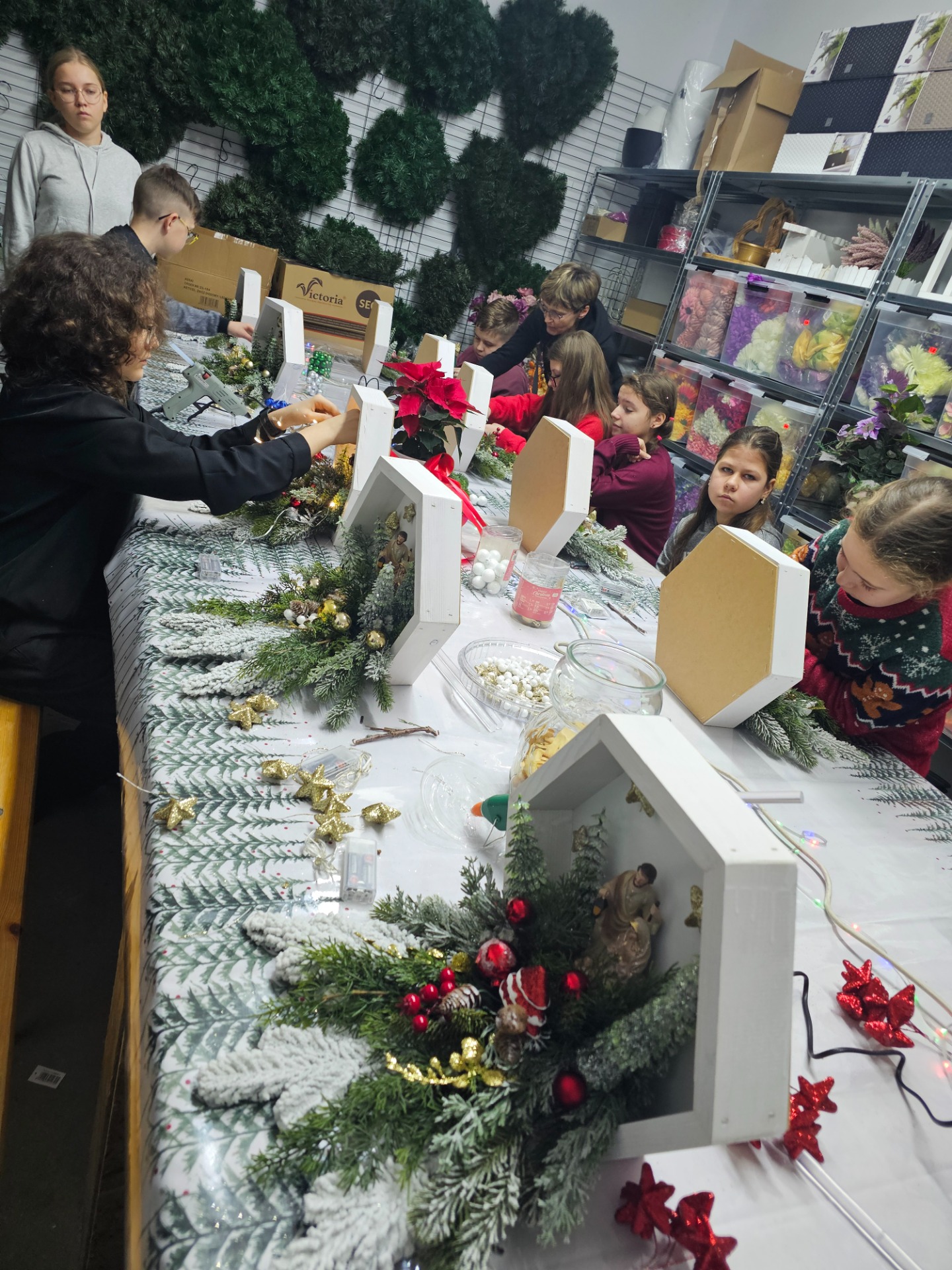W trakcie zajęć uczniowie wykonywali nastrojowe, bożonarodzeniowe szopki, wykorzystując figurki Świętej Rodziny, gałązki świerkowe, błyszczące bombki oraz lampki ledowe. Wszystkie te elementy zostały umocowane na drewnianych podstawach. Nad przebiegiem pracy czuwała pani Joanna, służąc uczestnikom instruktażem i pomocą.