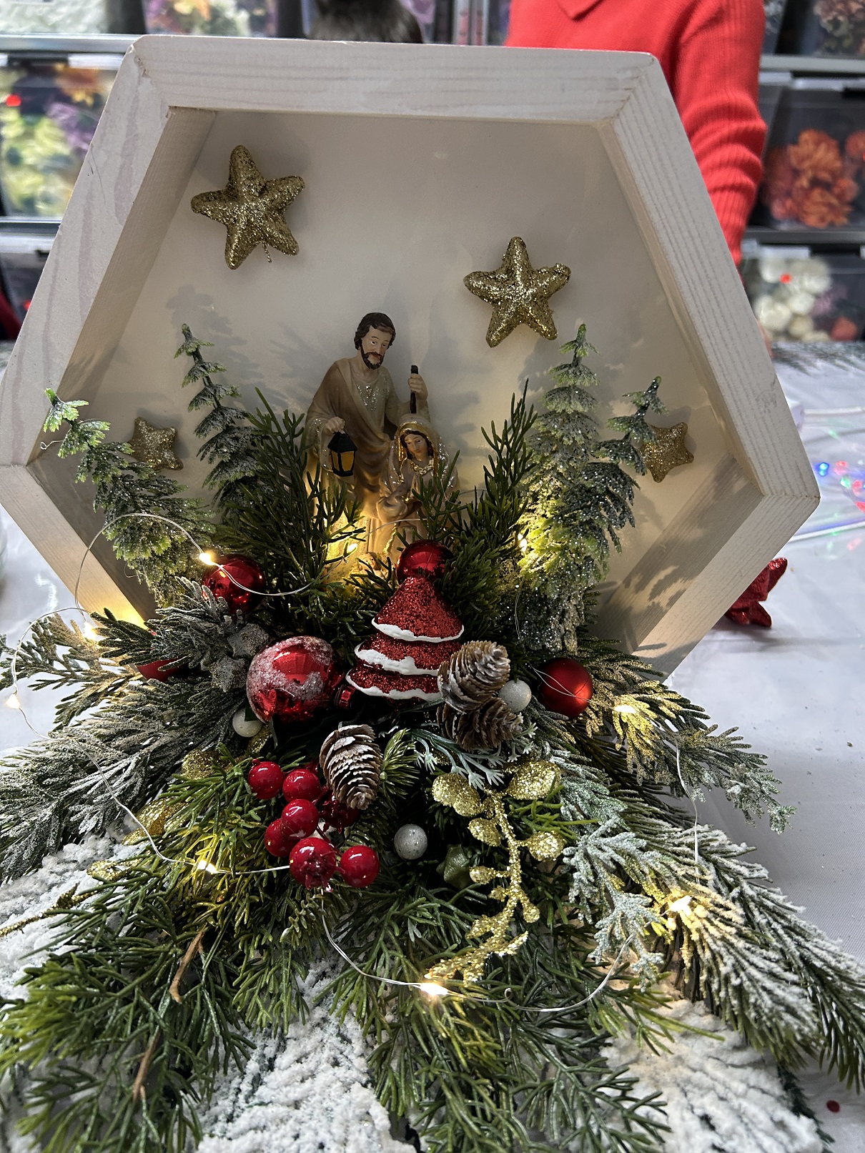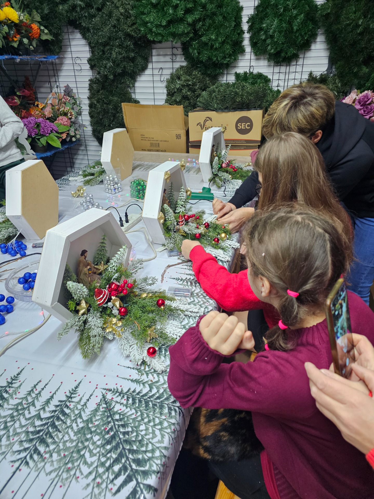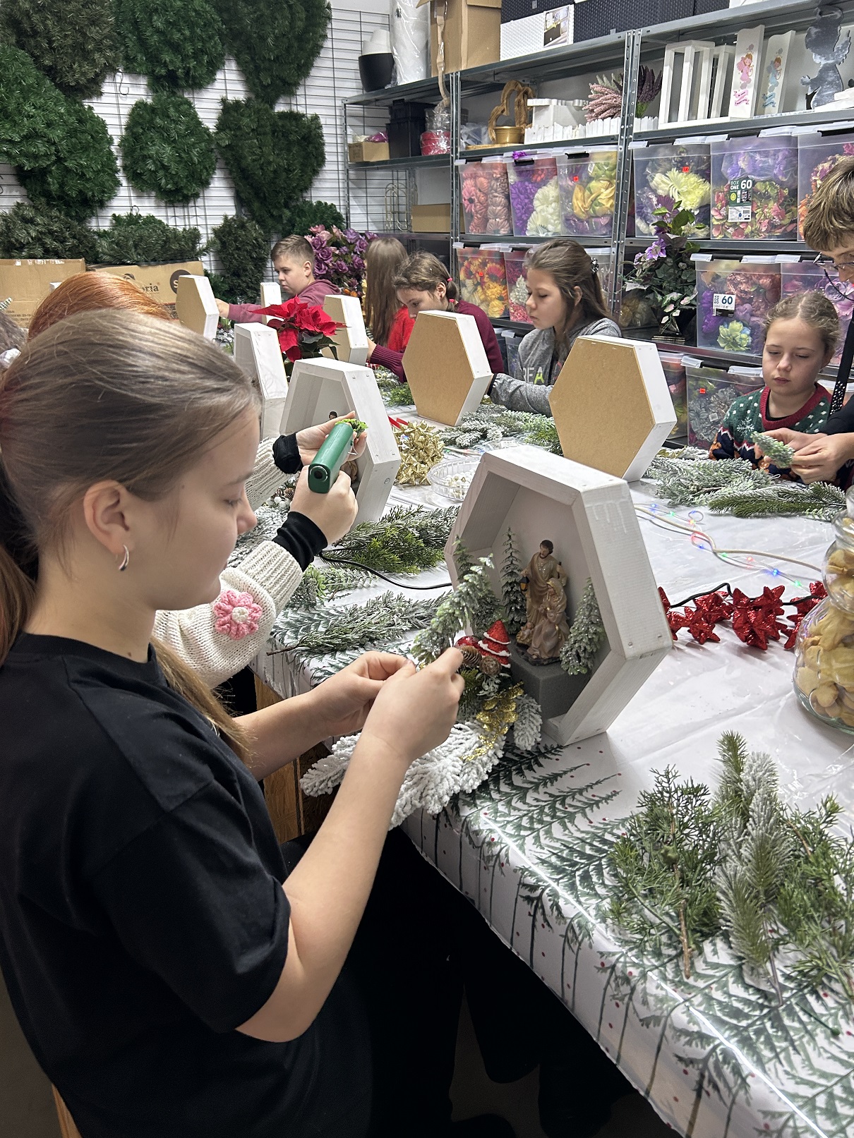 W trakcie zajęć uczniowie wykonywali nastrojowe, bożonarodzeniowe szopki, wykorzystując figurki Świętej Rodziny, gałązki świerkowe, błyszczące bombki oraz lampki ledowe. Wszystkie te elementy zostały umocowane na drewnianych podstawach. Nad przebiegiem pracy czuwała pani Joanna, służąc uczestnikom instruktażem i pomocą.